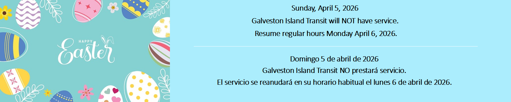 Domingo 5 de abril de 2026, Galveston Island Transit NO prestará servicio.