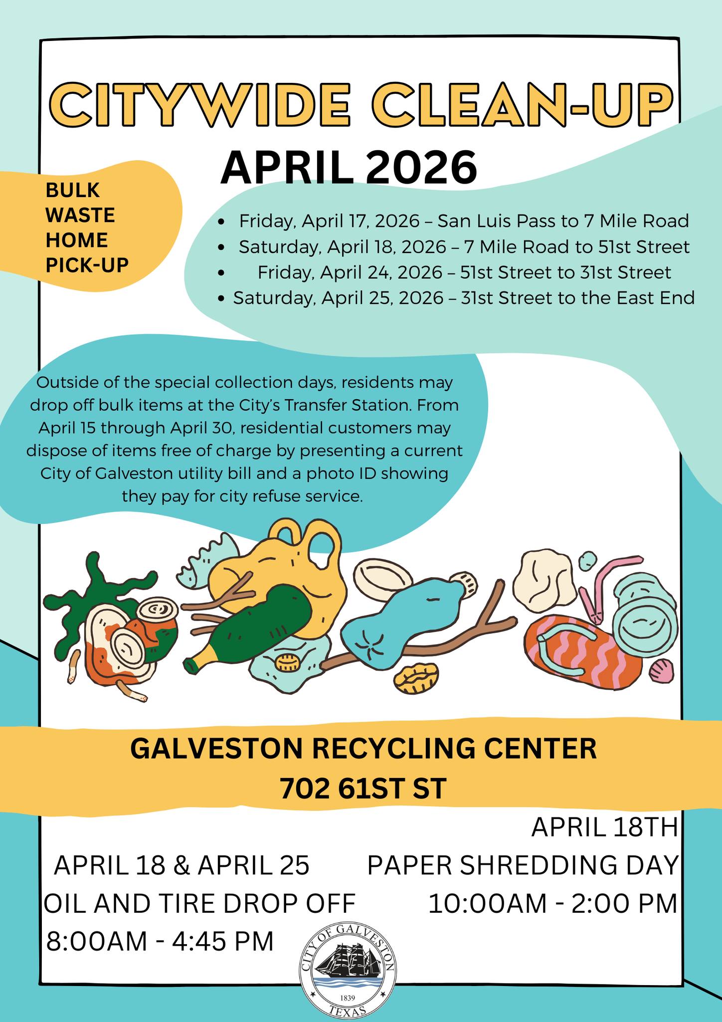 April 15–30, residents can drop off items at the Transfer Station (5515 Harborside Drive) at no cost. Just bring a current City of Galveston utility bill and photo ID.